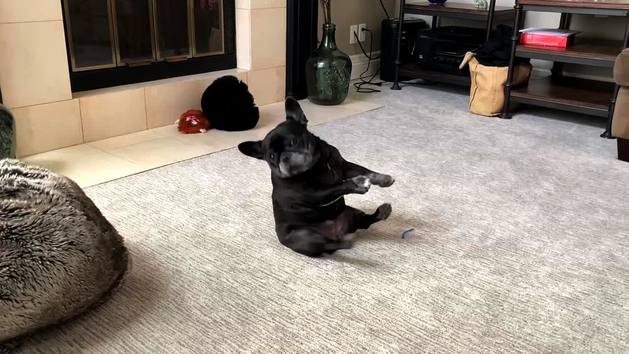 A French Bulldog sits on its rear and bobs its head and kicks its feet as it dances to some music. Music rights not cleared.