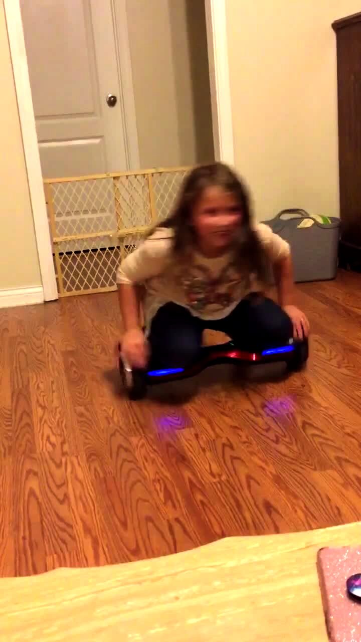 A young girl sits on a hover board and spins in circles. Then she rides backwards and crashes into a bookshelf, and a stack of DVDs fall on her head.