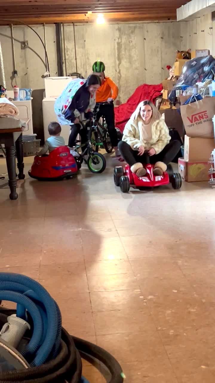 Three women ride kids' bicycles through a garage, then one of them falls down when her bicycle's handlebars snap off of it.