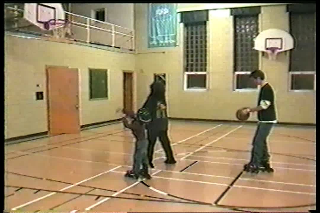 Guy hangs from basketball rim, it breaks, he falls