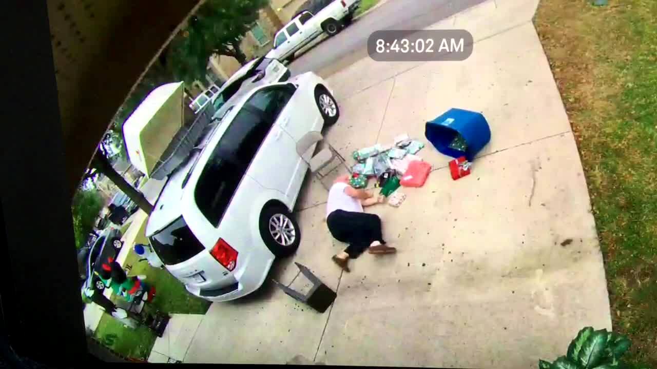 A man carries a big bucket to a car with Christmas presents in it. Then he stands on a chair and then on a stool to put them into the compartment on the roof of the car. He falls off the stool and all the presents fall. Security Camera Footage.