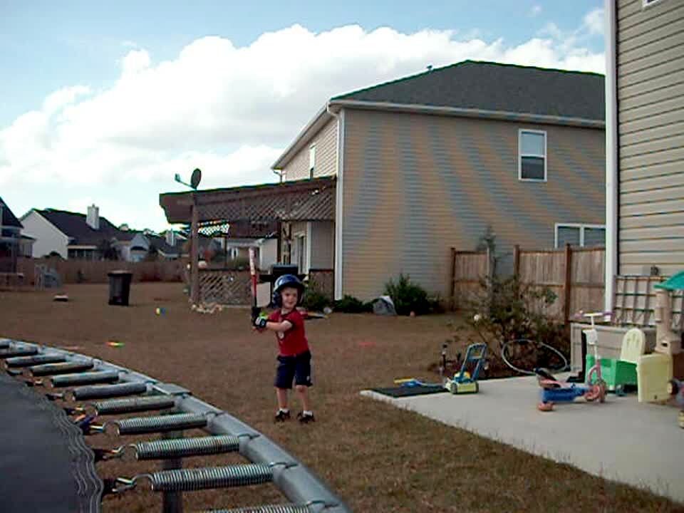 A tot boy in a yard hits a ball off a tee with a baseball bat and it hits a man in the groin and the tot boy laughs. Security camera.