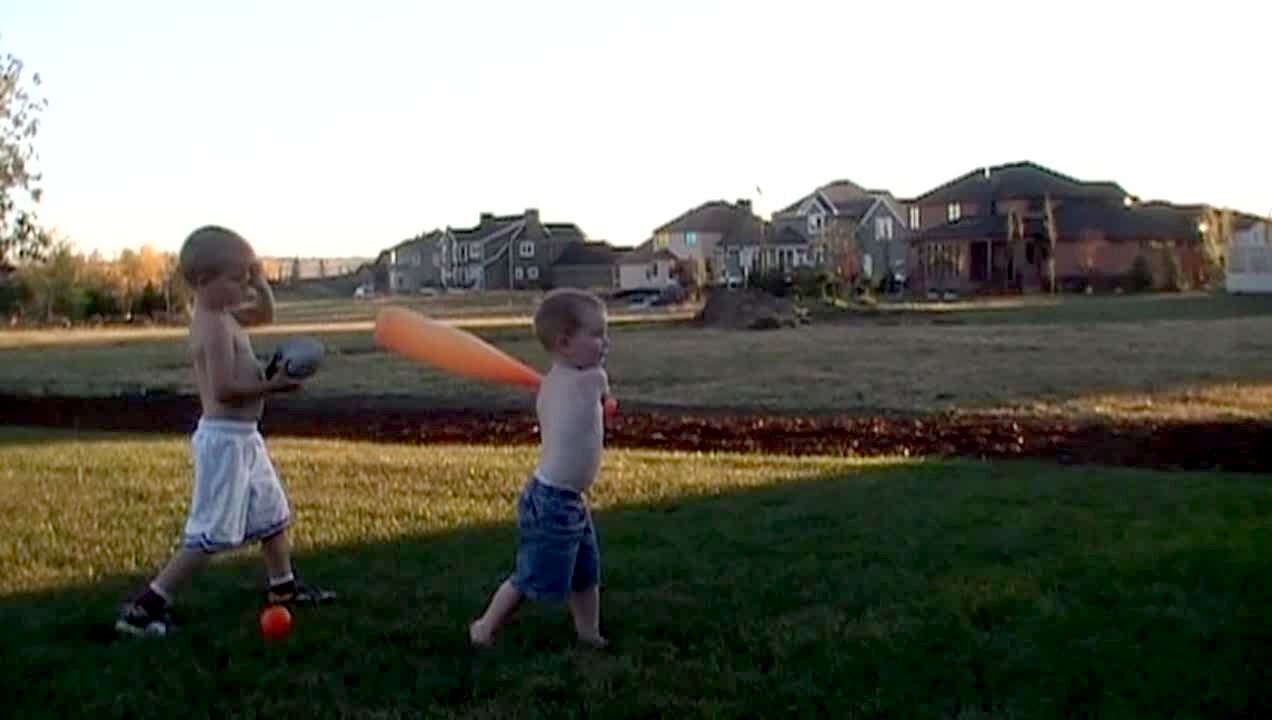 A man plays ball with a little boy with a bat outdoors. The boy swings his bat, hitting an older boy in the crotch. The older boy gets mad and hits the little boy. The man laughs, telling the camera this is an AFV moment.