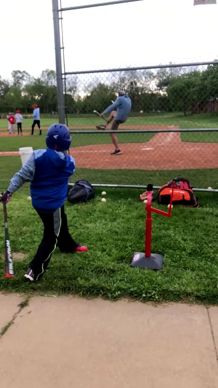 Little boy hits baseball in backyard, the ball flies towards the camera and the man behind it catches the ball between his legs.