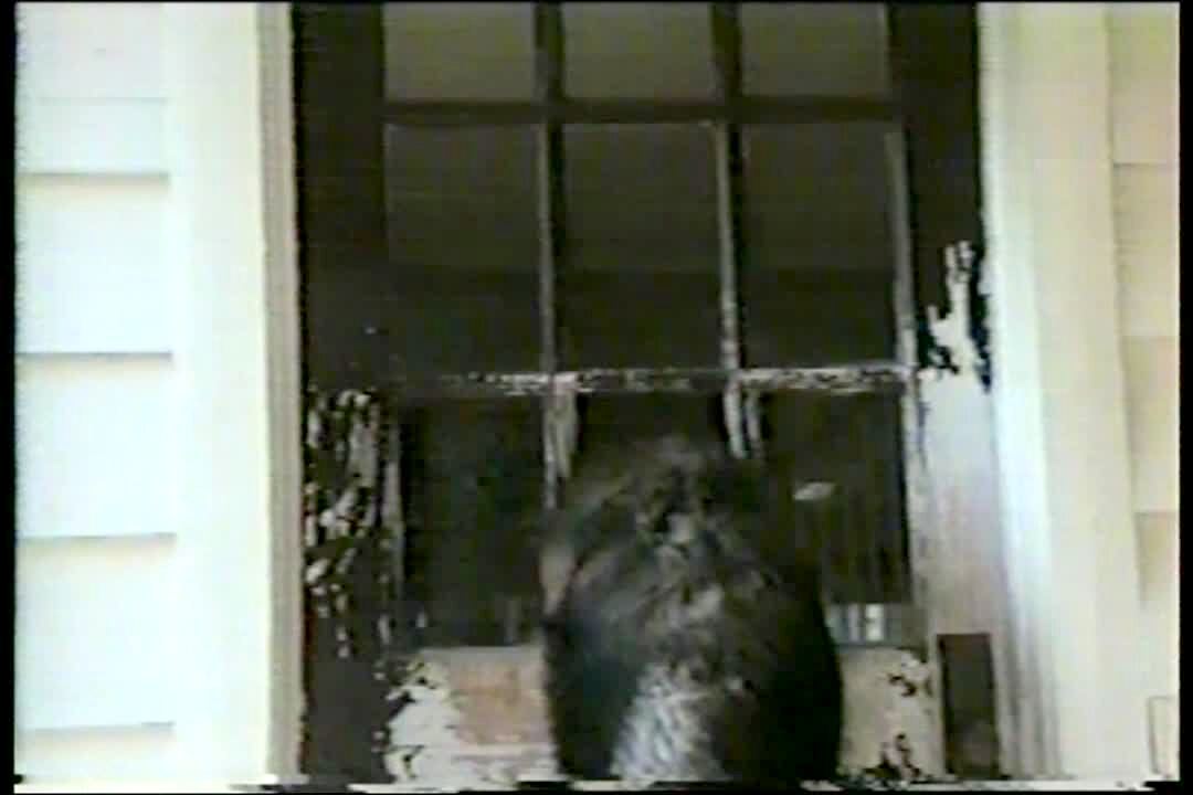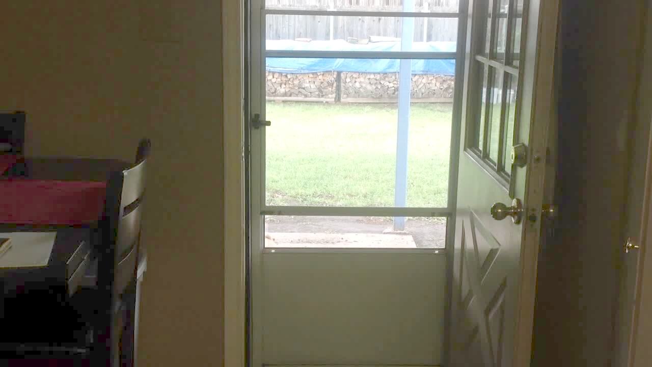 Dog jumps over Plexiglas door to get into living room. Animal escapes.