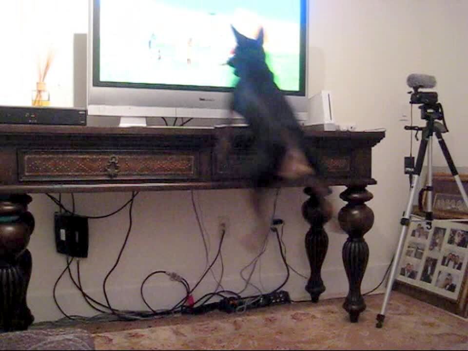 A small dog jumps up and down in front of a television playing a video of a dog jumping up and down at home.