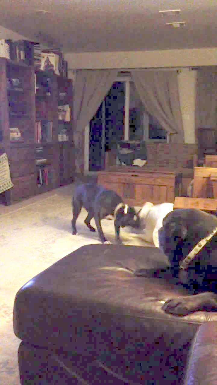 Pug dog and boxer dog viciously bark at a fake pug dog statue. Living room.