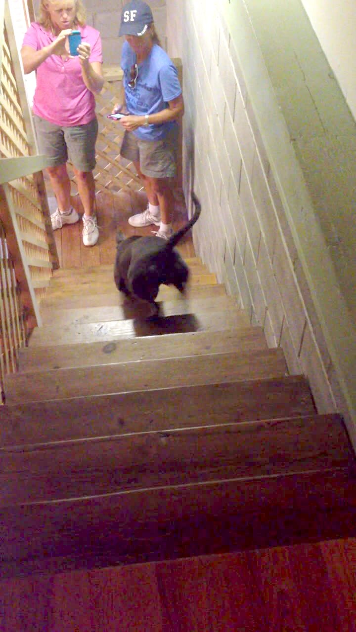 A black dog walks down a flight of stairs indoors with minimal stumbling and is followed by a small brown dog who flops and rolls down the stairs.