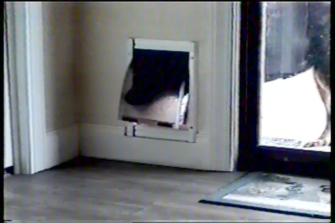 Pug goes through small doggie door, then big Rottweiler dog squeezes through it.