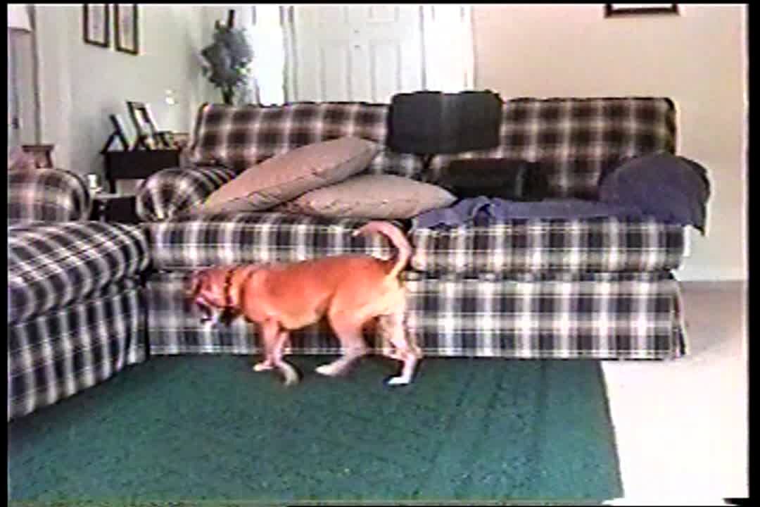 Big dog chases small dog/ Chihuahua around living room. Small dog runs under couch and through small opening that the big dog has a hard time getting through