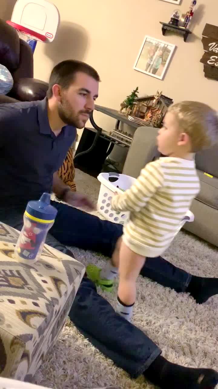 A woman films a baby boy at home, then it sounds like the baby boy says "can you back up?"