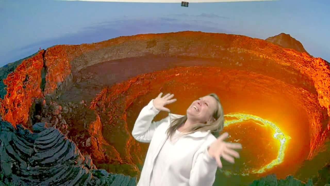 A woman yells "I'm melting" and pretends to shrink at a school, but she crashes into a green screen backdrop and knocks it down as she falls.