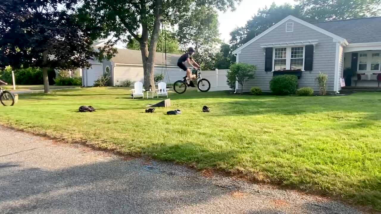 Three young kids ride bicycles over a ramp in a yard, then a fourth young boy crashes and falls down.