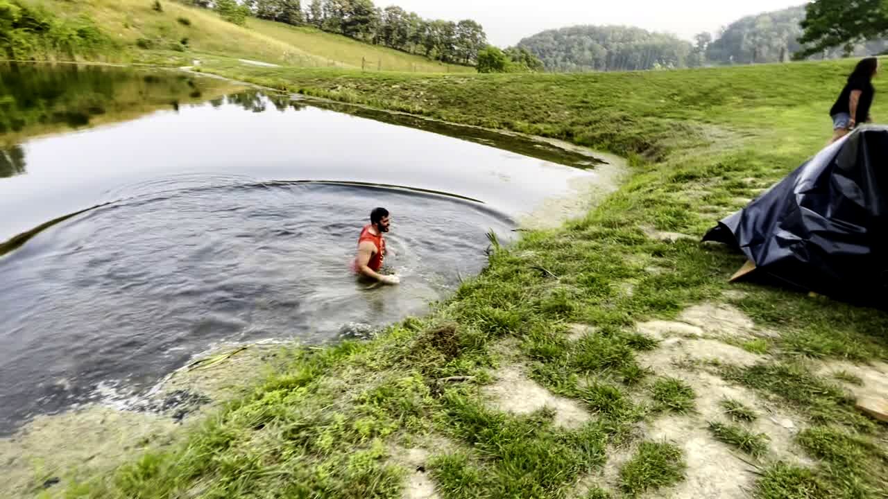 A senior man zip lines over a backyard pool, but the line breaks, and he falls in the water.
