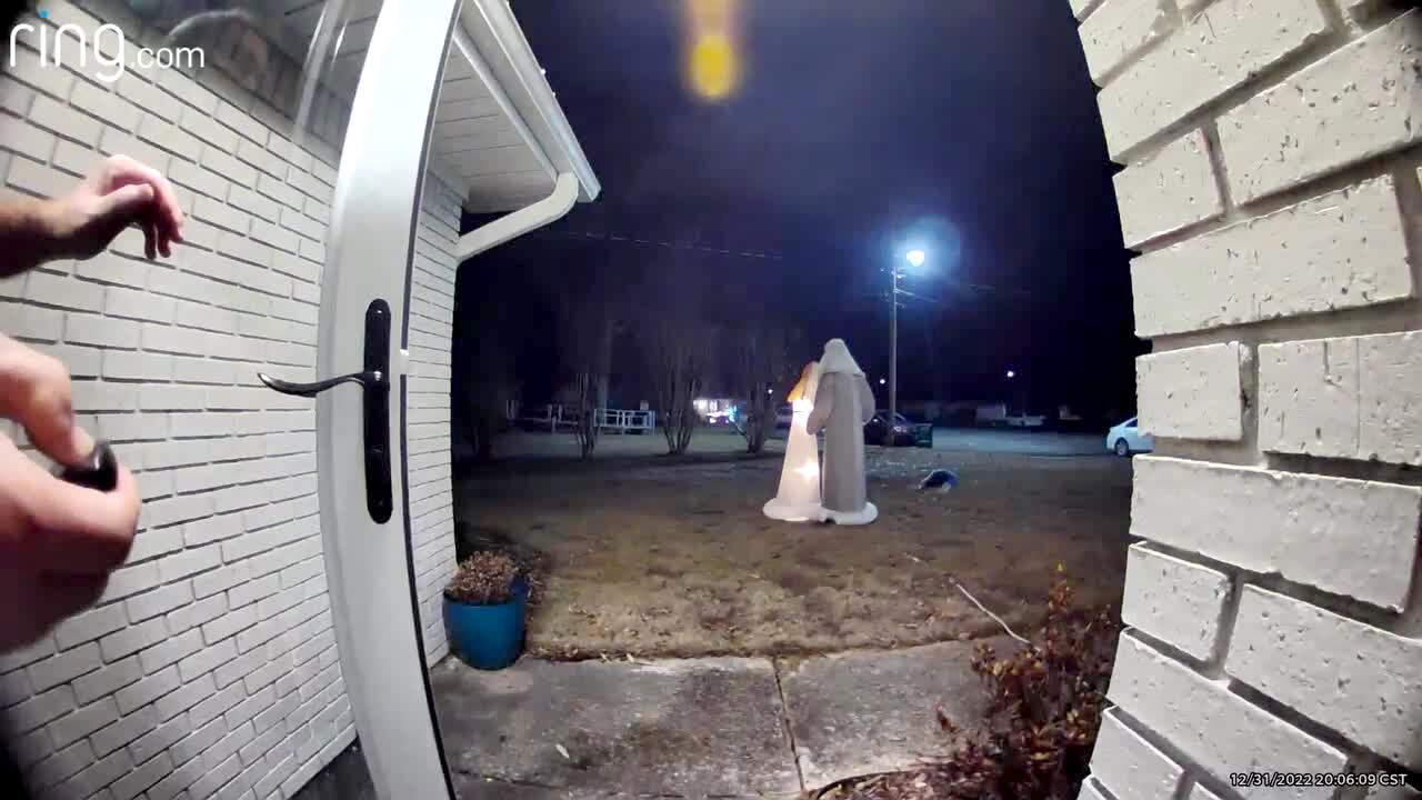 A man removes a drain plug from the back of a camper. Water shoots out towards him, knocking him down in the backyard. Security footage
