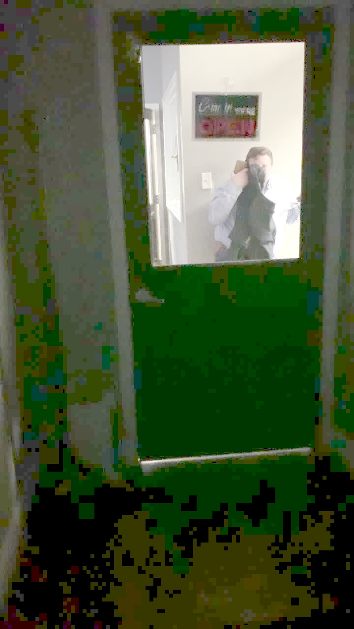 A teen girl scares a man when he sees her through a door in an empty building. The man screams and falls to the floor.