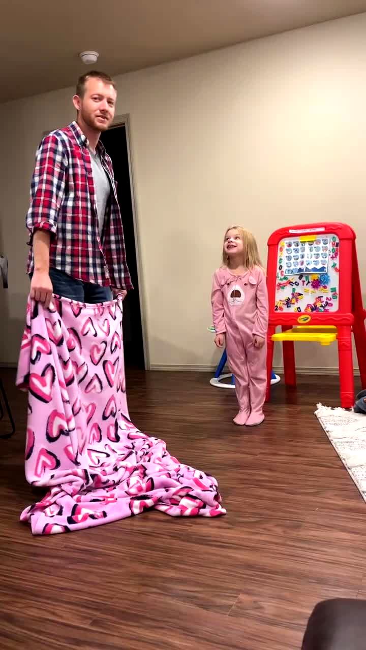 A tot girl and her father perform a magic trick. The girl is behind a blanket but visibly disappears into another room when the man removes the blanket.