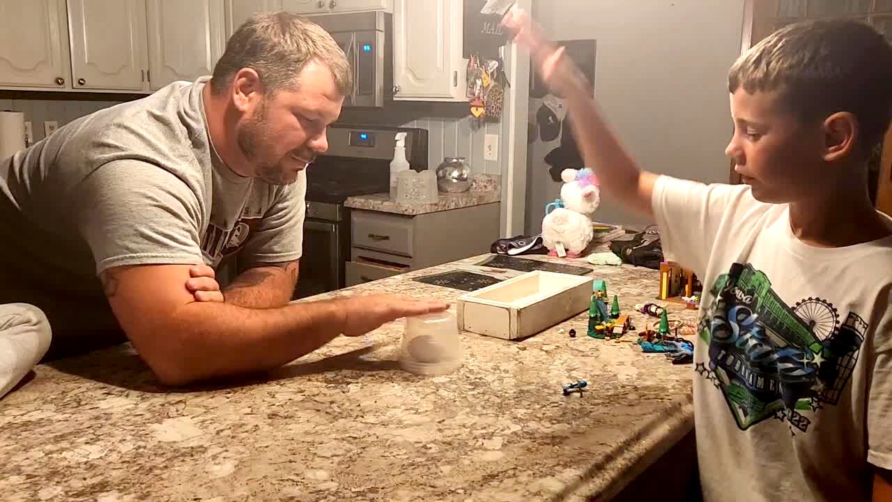 A young boy and a man play the egg smash challenge in a kitchen. The boy giggles when the man smacks the egg with force. Egg Smash Challenge.