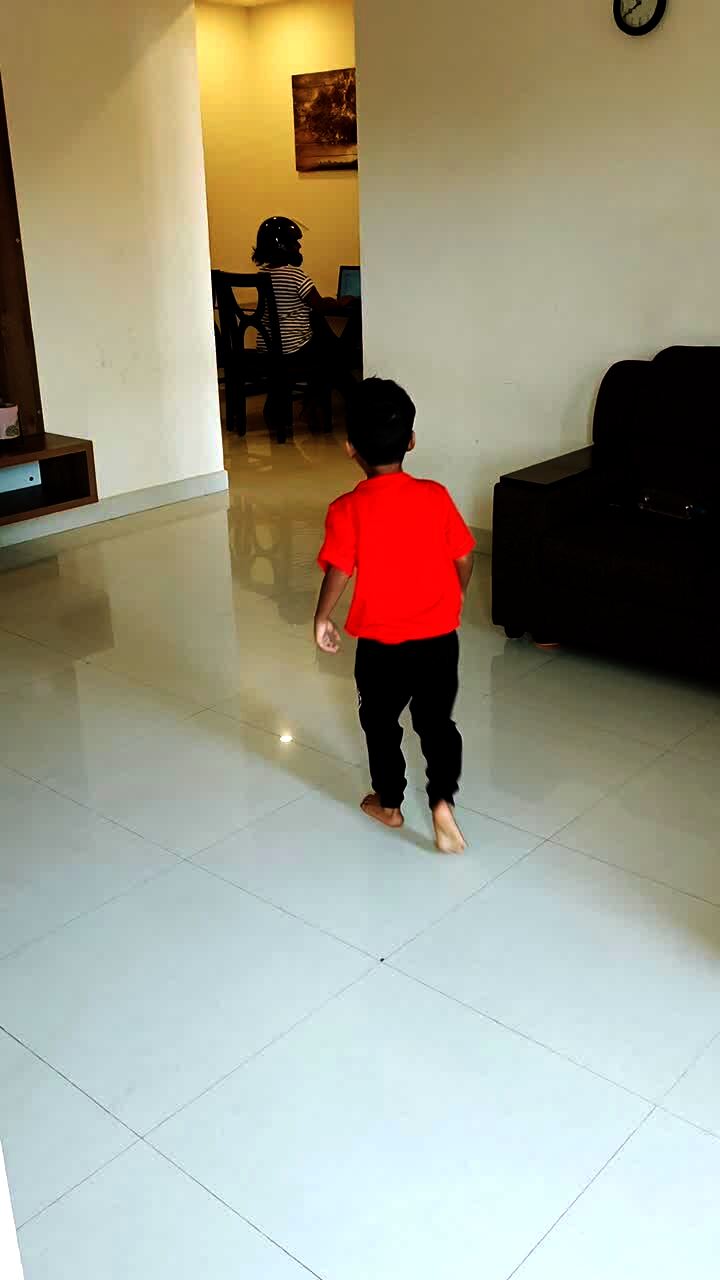 A young boy jumps playing a VR game and lands on a coffee table, which knocks his headset off.