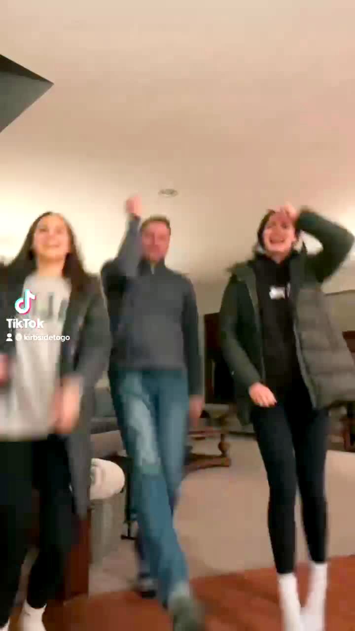 Two teen girls and their father dance in the living room. Two large dogs run through the room and cause the father to fall to the ground. Tik Tok video.