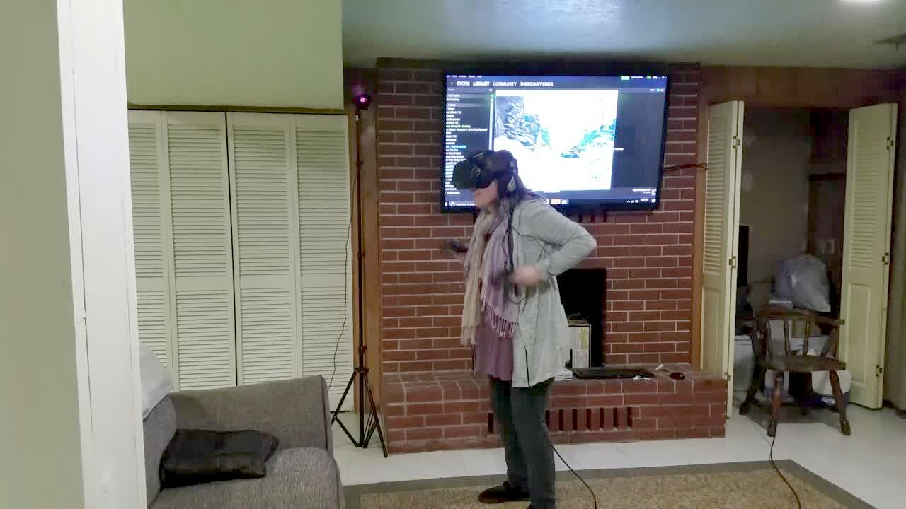 A woman falls down as she uses a virtual reality headset.