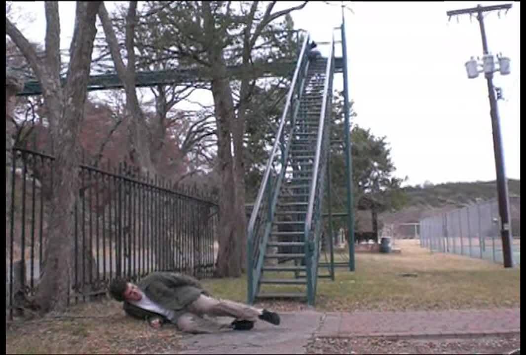 Teen girl tries to ride bike off ramp into pond, stumbles and falls off ramp. Caucasian.