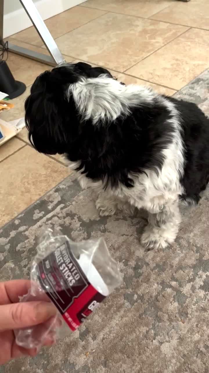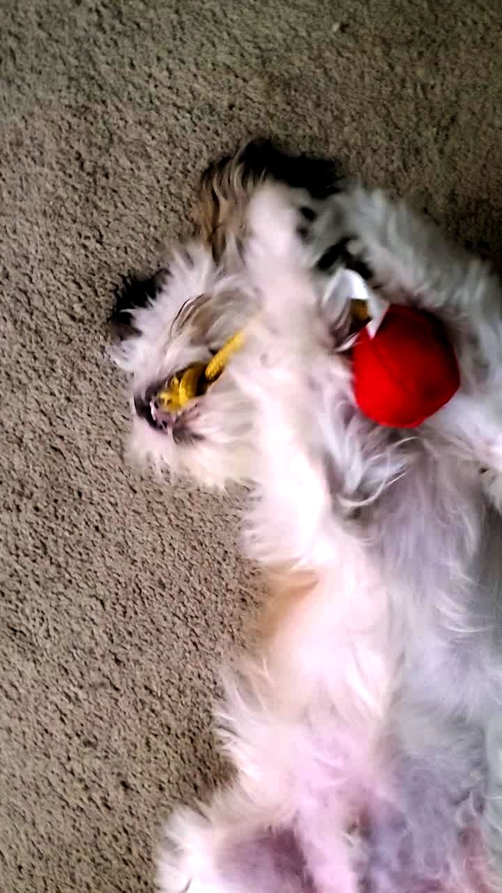 A Shih Tzu puppy dog lies on his back and plays with a toy at home. Then a woman gasps, and the dog drops the toy and jumps to his feet. Gasp At Your Dog Challenge