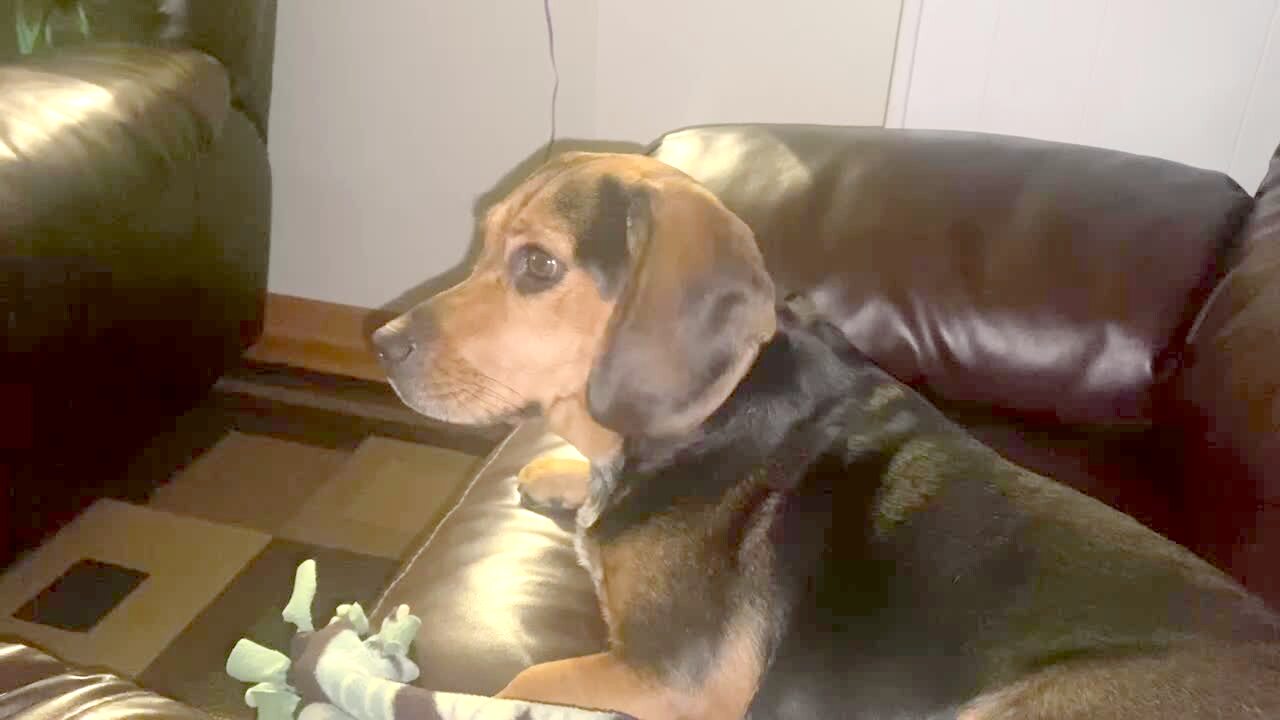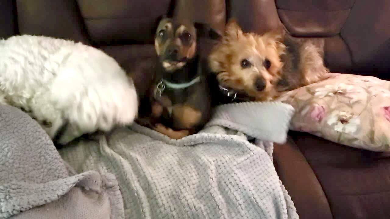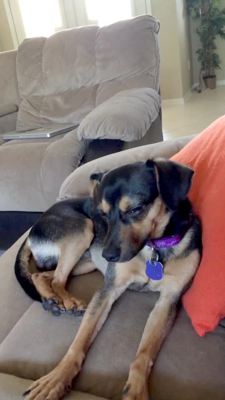 A woman gasps at her dog while he sleeps on a couch but jumps up when he hears her.