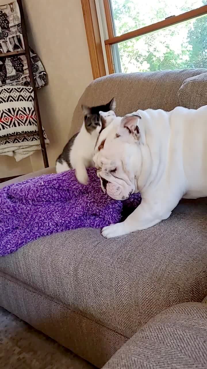 A cat repeatedly hits an English bulldog dog's face on a living room couch. Then they both sit still while the dog looks away.