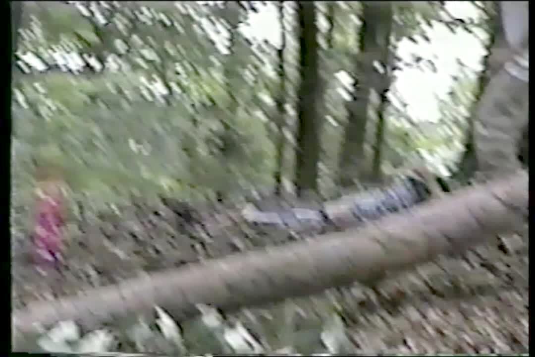 Boy climbs in between 2 trees, then falls down out of sight.