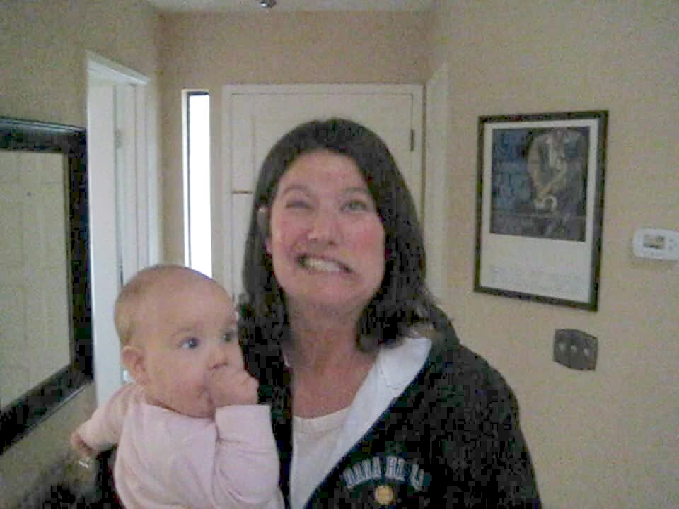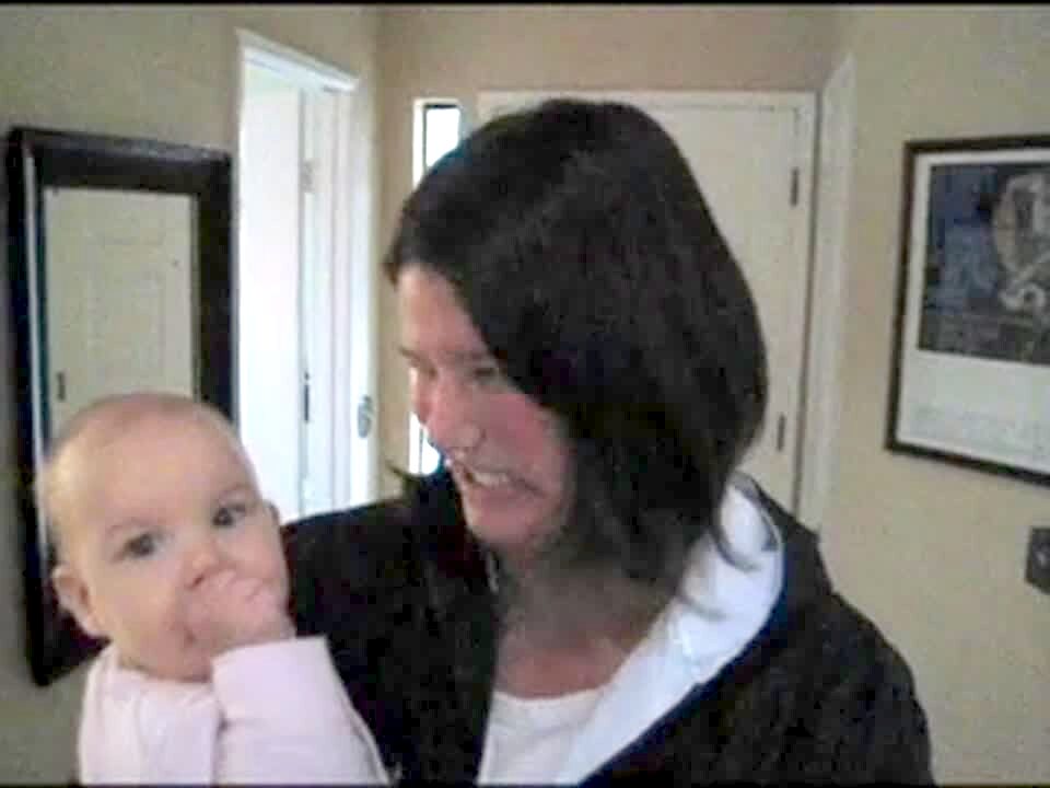 "Numb Mum" Mom holding baby girl has just come back from the dentist. Her mouth is hanging down from the novocaine & she laughs about it. Weird.
