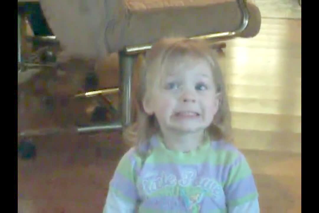 A tot girl in a bedroom tells the woman behind the camera that she accidentally hit containers of cookies, then they fell on her, and "a couple of them went into my mouth."