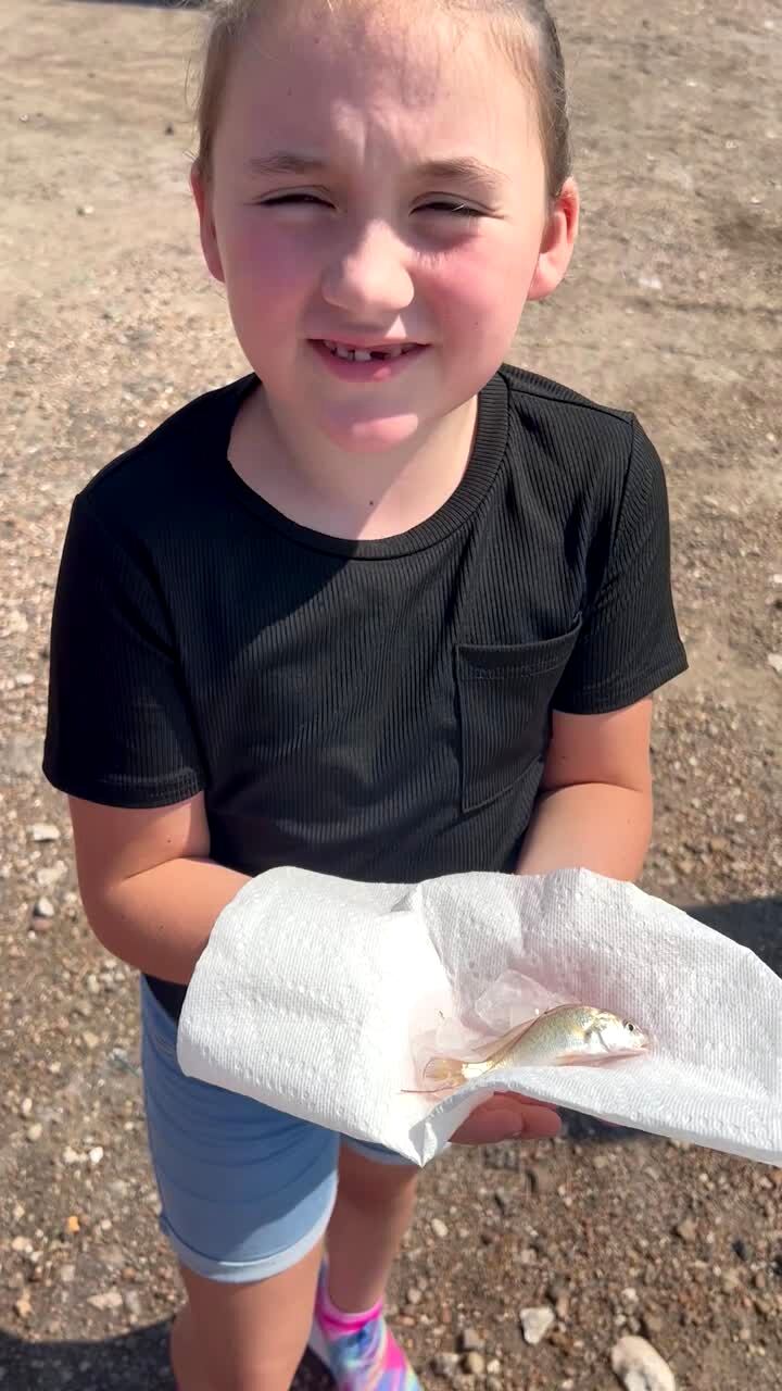 A young girl stands outside and holds a fish in a paper towel and the girl says "today we are going to save this little baby fish, he will survive in the bait shop." The girl drops the fish into the water and it lays motionless for a moment when a bird swoops down and takes the fish out of the water and flies away.