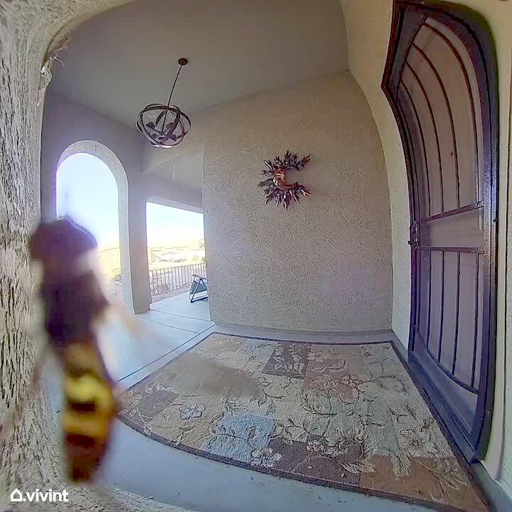 A wasp bug lands on a security camera on a porch and rings a doorbell twice, and a dog barks inside the house. Security footage.
