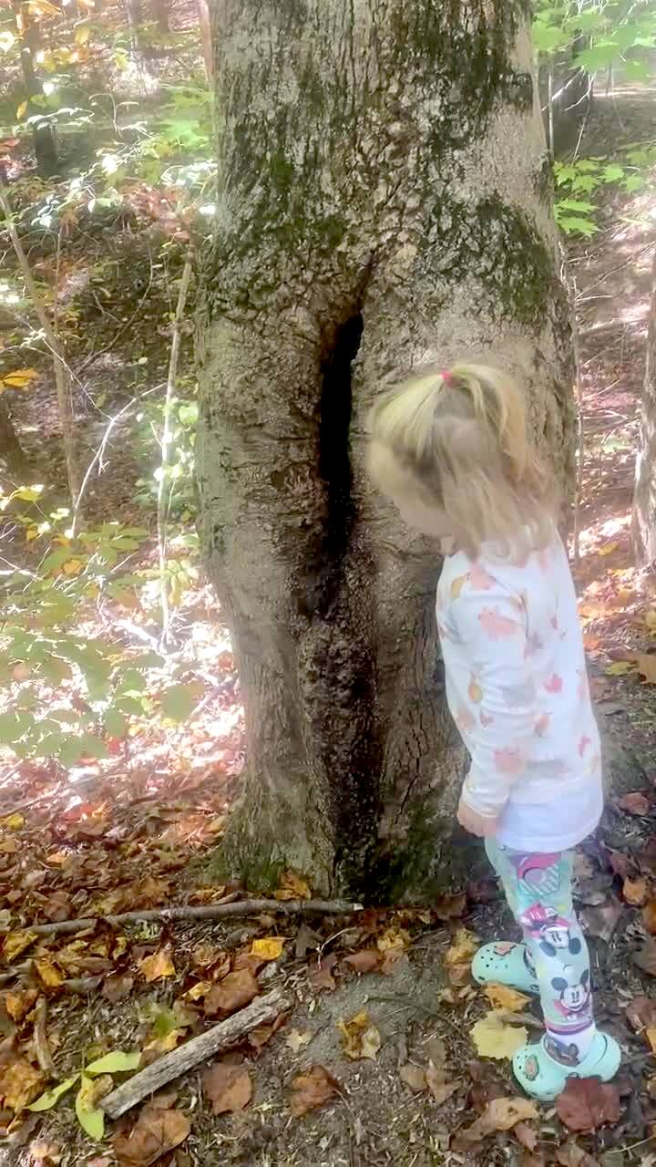 A tot girl tells a woman that a tree trunk is shaped like a "butt crack...mama's butt crack." kids say.