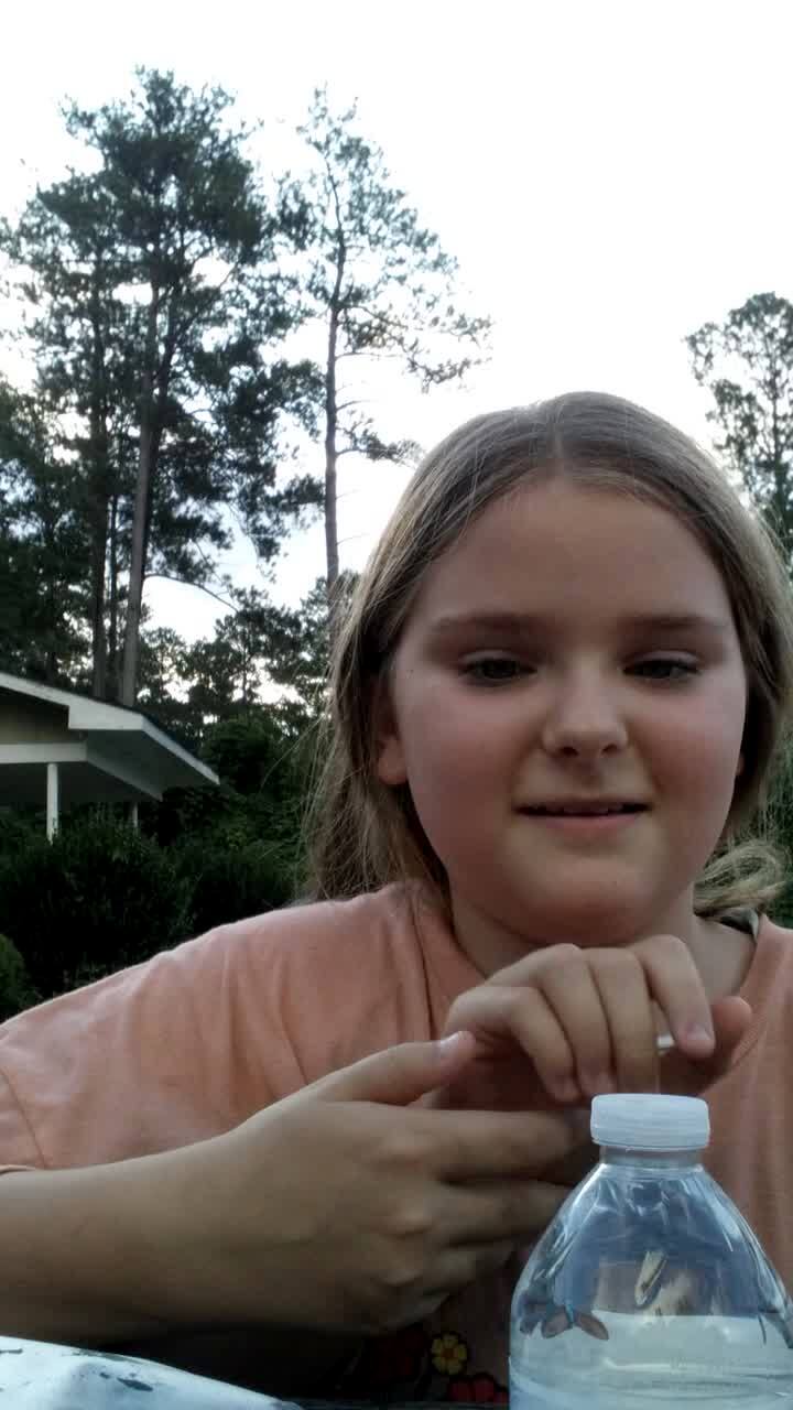 Two young girls do the Borrowed Hands challenge, and they each yell at the other to move over while they sit down in a chair. Then the young girl in the back pushes a cupcake into the front girl's face and gets frosting all over her. They try to open a bottle of water in the front young girl's mouth, then the front girl uses her hands to open it.