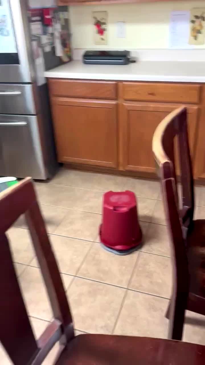 A man and a woman do the computer-mouse-in-the-house prank on a man and he climbs up on a stool and lifts the bucket and walks out of the room and comes back and laughs in the kitchen.