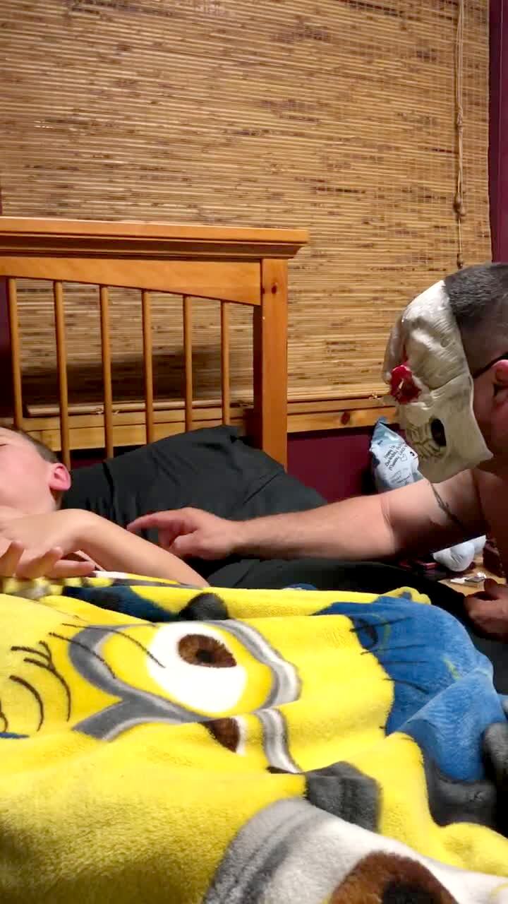 A person in a life-sized bear suit waits for a young boy to get off of a school bus, then they chase the boy down a road and crash into a pole. Social media video.