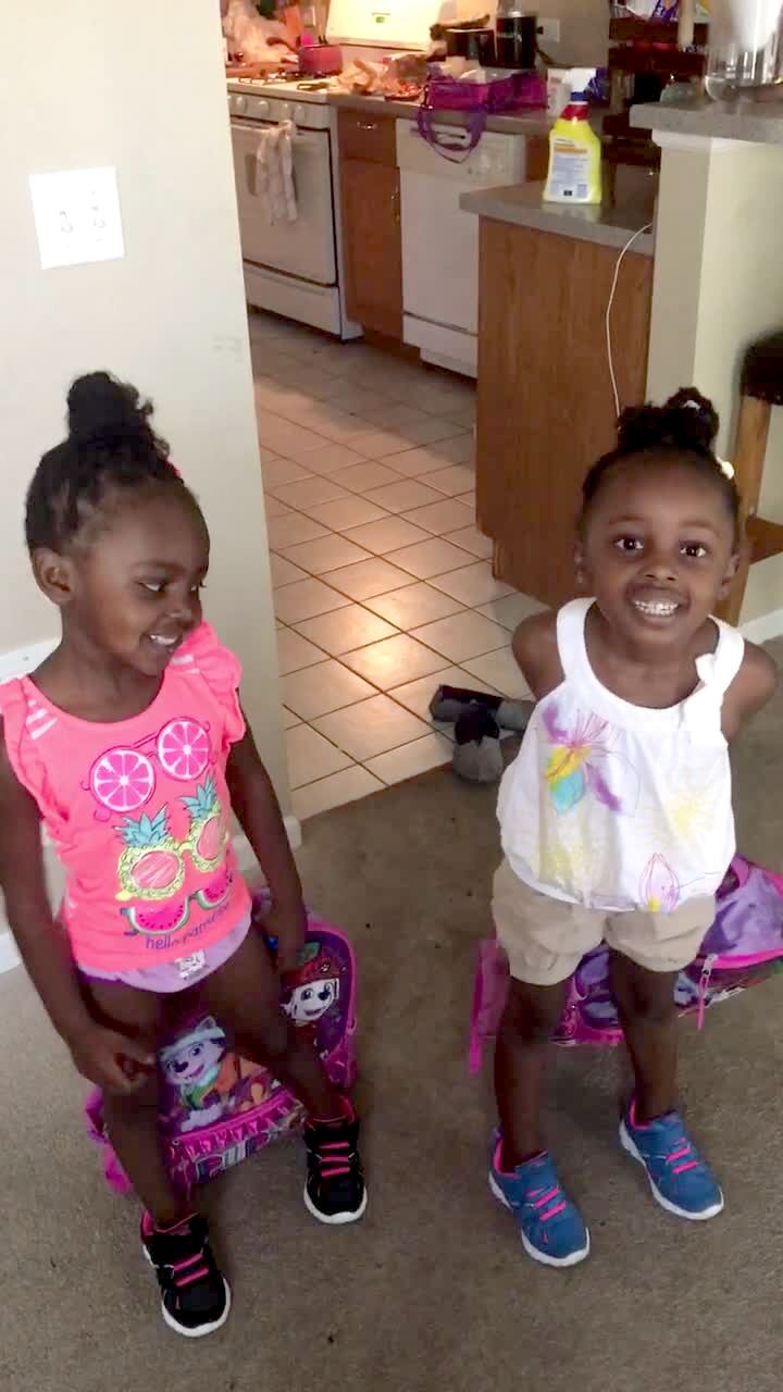 A woman talks to her twin young girls to make sure that they have everything they need for school and one of the girls doesn't have pants on. Their mom asks if they have their pants and they both say "yes." Then the other girl points to her sister and says that she doesn't have pants and the girl gets embarrassed.