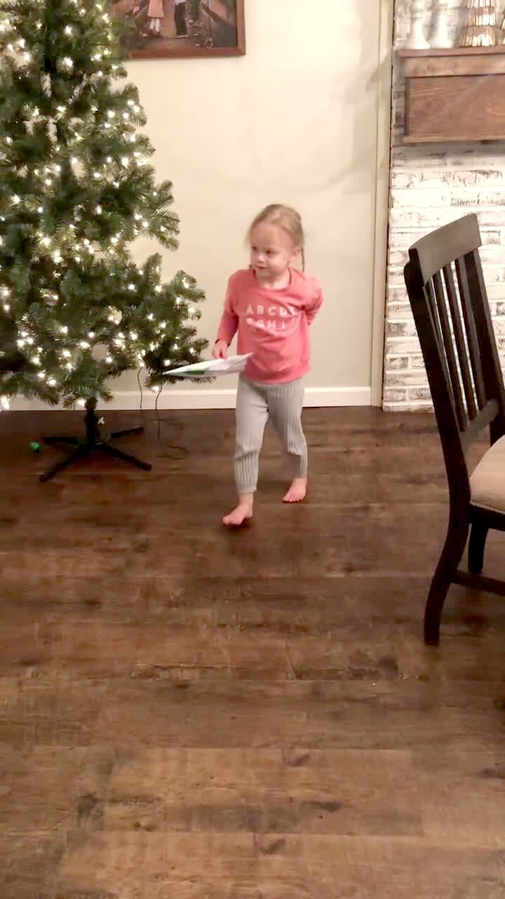 A young boy throws a paper airplane in front of a Christmas tree and it lands in a young girls pants in the living-room.