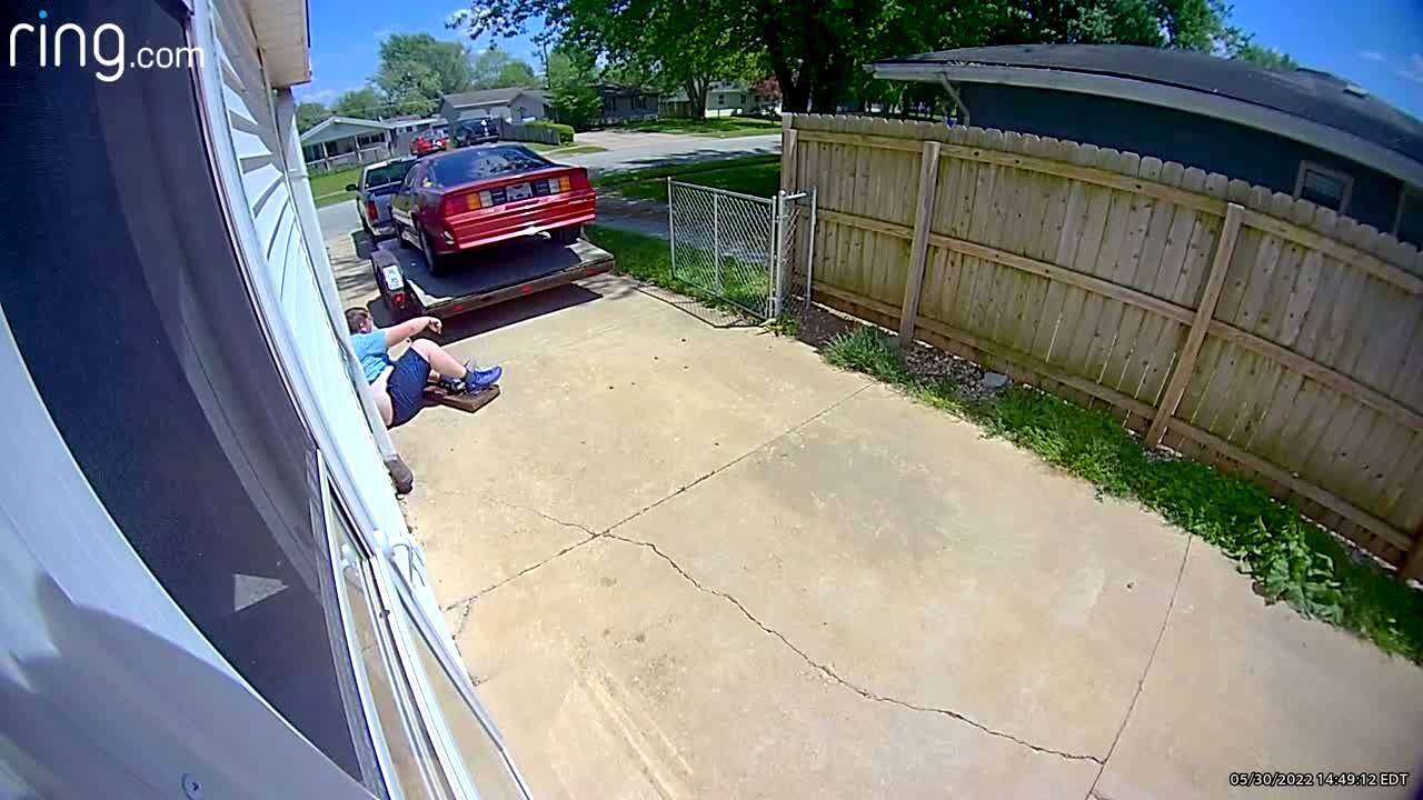 A man pretends to be a reporter while Hurricane Ian blows through his backyard. He then steps on and breaks a hole in the patio deck. His leg goes through a plank and he gets stuck and falls backwards.
