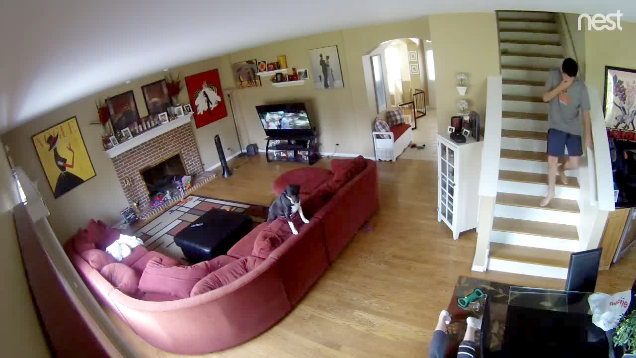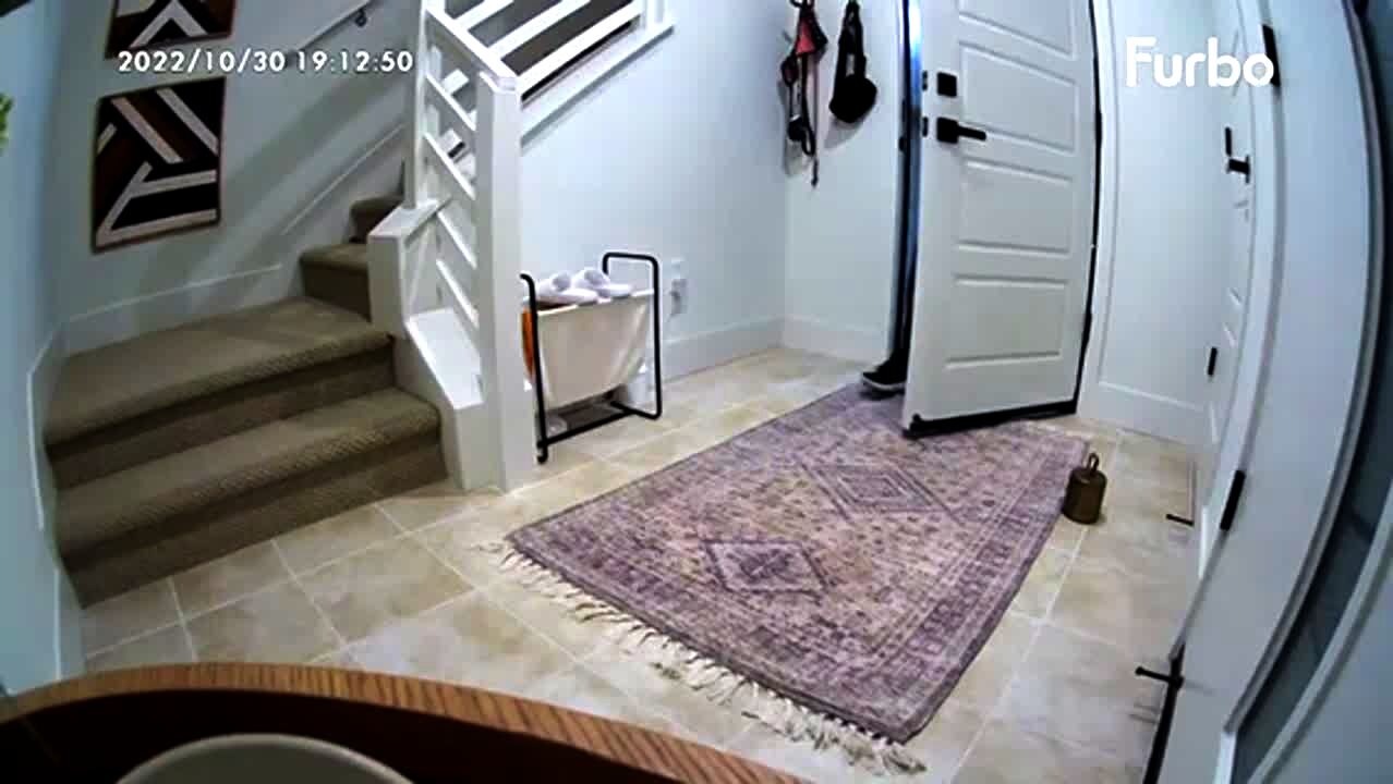 A woman walks into a living room and sits down on a recliner, which tips backwards and throws her onto the living room floor. Security footage.