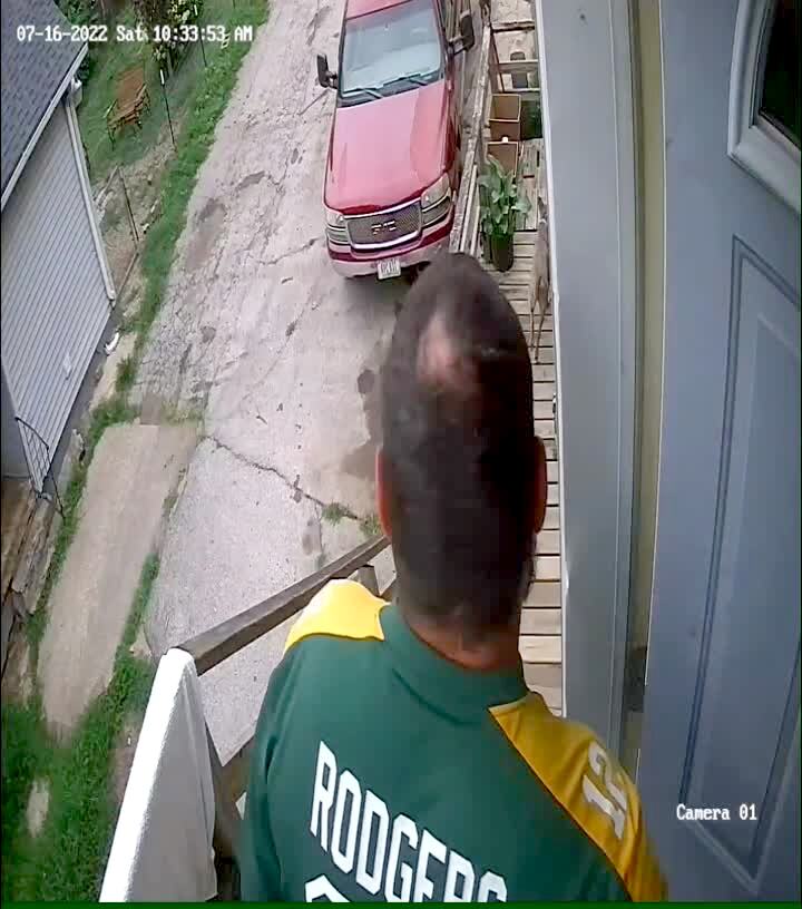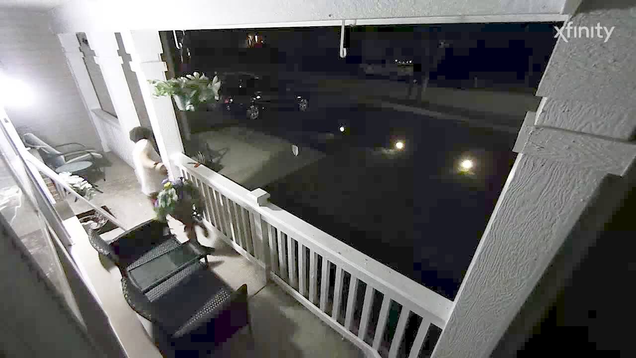 A teen boy takes down a hanging plant and a bird flies out of it. He screams on the front-porch and runs into the house. Security footage. Night. Dark