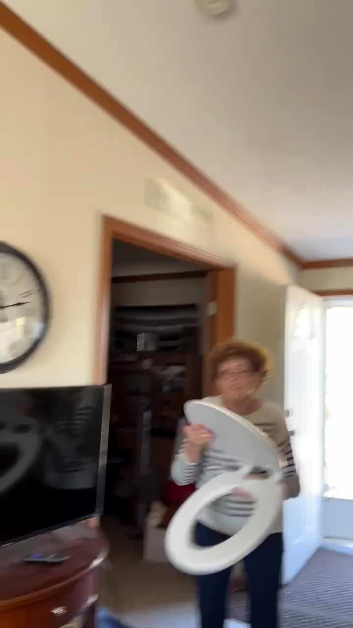A smoke alarm beeps in a living room, and a senior woman holds up a toilet seat and opens and closes it quickly in an attempt to stop the smoke alarm. The smoke alarm continues to beep.