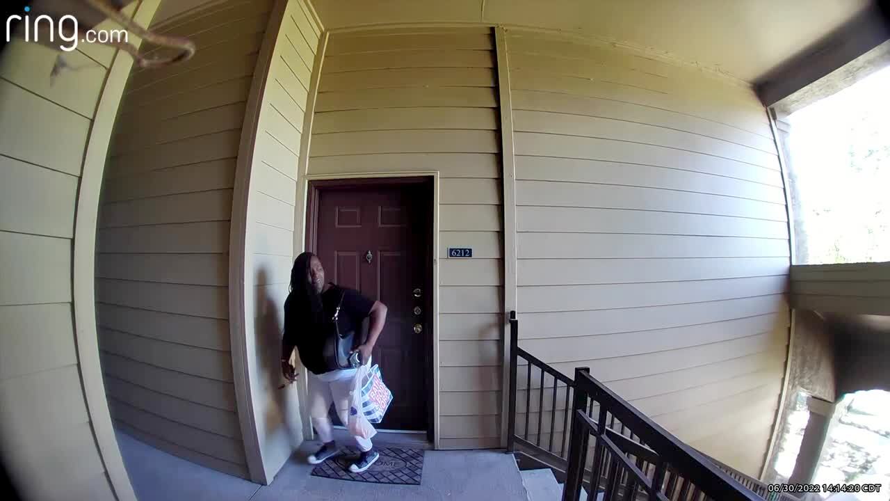 A woman walks towards a front door. Suddenly, a bird flies up and out in front of her. The woman stumbles back and falls. Security Camera