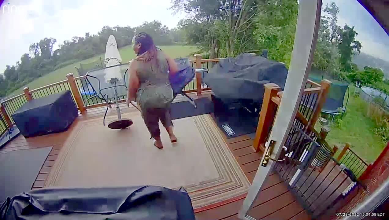 A woman tries to secure a patio umbrella in the wind ahead of an upcoming storm. But then a gust of wind knocks over the table and when the woman pulls out the umbrella, the pole breaks the glass tabletop. A young boy yells for her to come inside and a dog barks in the house. Security footage.