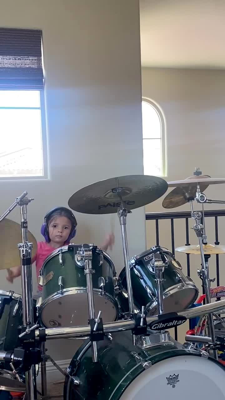 A young girl plays drums in a living room while off-camera a young boy shouts "you're terrible!" The girl shouts back, "I can't hear you."
