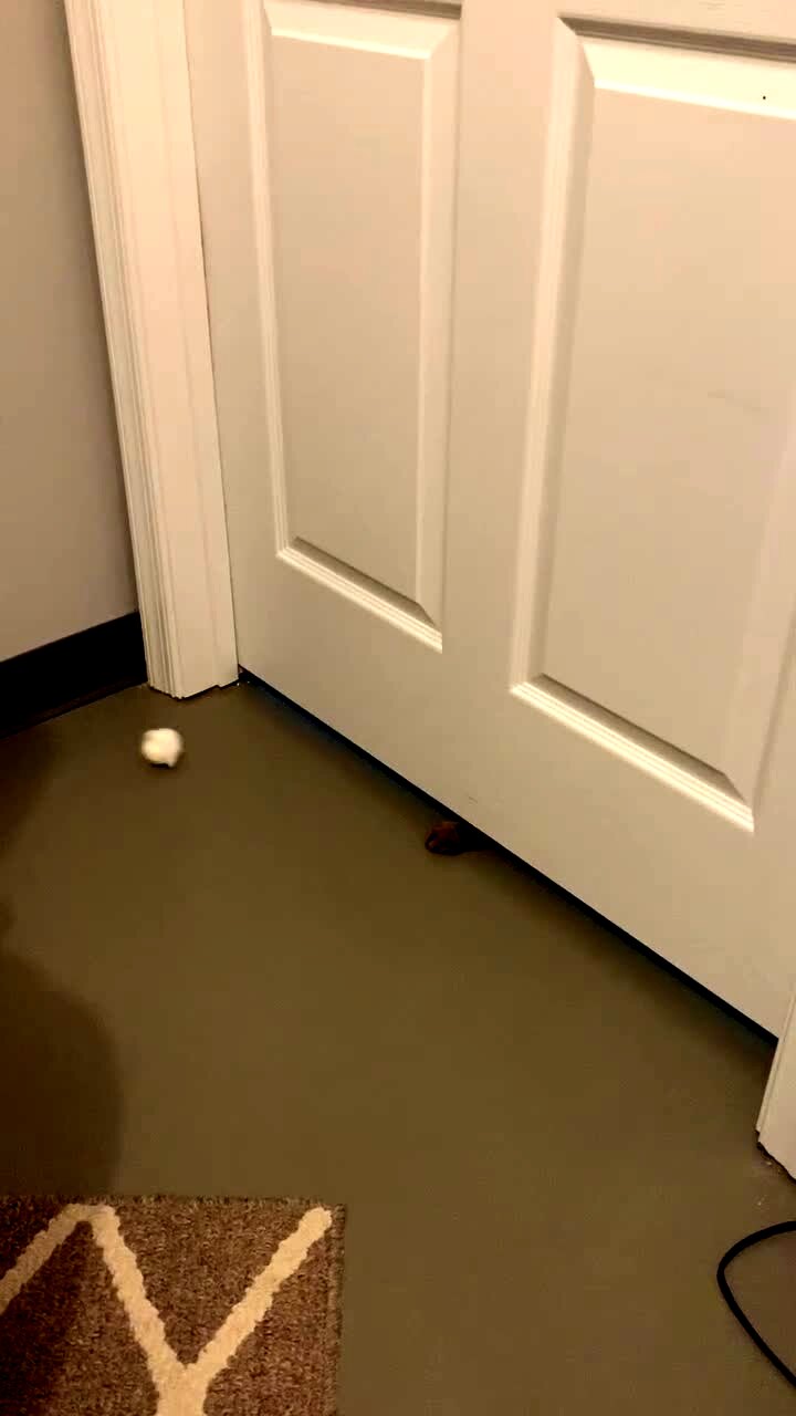 A man throws a tiny ball towards a door. A cat paw from under the door hits the ball back. They continue to play with the ball back and forth several times before the cat grabs the ball with both paws from under the door and takes it under the door away from the man.
