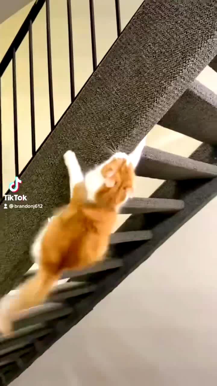 A cat climbs upside down on a flight of carpeted stairs at home and briefly stops to hang from the stairs as music plays over the clip. TikTok video.