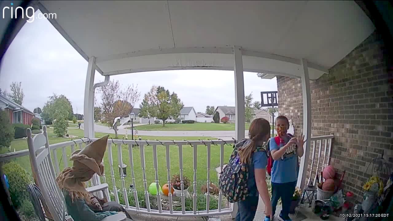 A young girl and a young boy come home to a scary Halloween decoration over their front door on the porch. They argue about which one of them will open the door. When they finally touch the door, then the decoration makes a hissing sound and they both run away. Security camera footage.